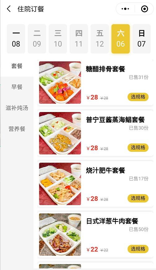 通過判斷用戶綁卡信息,系統可引導職工、病患在線上指定訂餐區完成點餐。用戶可一次性在線上完成三天跨度的餐品預定,大大縮短傳統線下點餐需要耗費的時間。