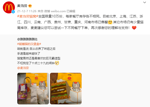 2021年12月,麥當(dāng)勞推出「漢堡貓窩」并在全國線下門店限量銷售十萬份。活動開始后不到一小時,麥當(dāng)勞就宣布全國多地門店已售罄,麥當(dāng)勞APP更是一度崩潰。